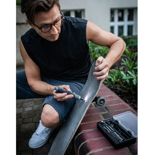 Zestaw składa się z: wkrętaka z ergonomicznym uchwytem i dwoma intuicyjnymi przyciskami kierunkowymi, umożliwiającymi łatwe wkręcanie i wykręcanie. Zestaw zawiera także 10 końcówek w różnych rozmiarach, 4 dodatkowe przedłużki, magnetyczną przedłużkę oraz kabel USB do ładowania. Całość w solidnym etui. Urządzenie doskonale sprawdza się w pracach montażowych, serwisowych, przy składaniu mebli, w elektronice oraz modelarstwie. Bateria akumulatorowa 1300mAh, moment obrotowy 3 Nm. Prędkość 250 obr./min.