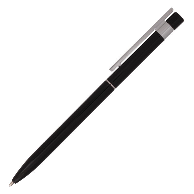 Metalowy długopis z chromowanymi wykończeniami i klipem o niezwykle oryginalnym kształcie. Wyposażony w niebieski wkład.